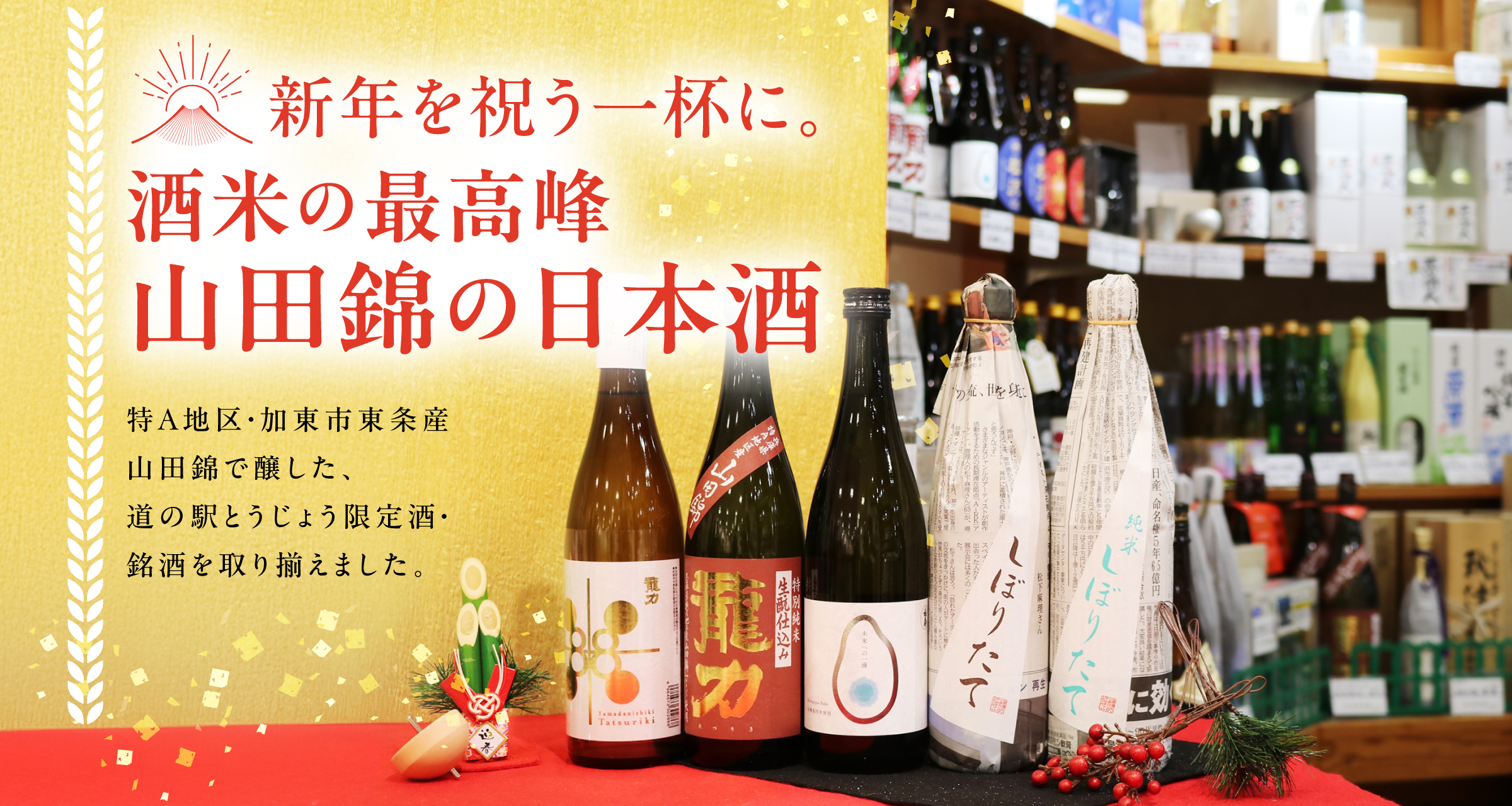 全国の酒造家から高い評価を受ける「山田錦」の特A地区を有する東条地区。その誇るべき酒米を活かした地元の銘酒が並び、山田錦を使用したスイーツやお菓子など、新しい形でその魅力を味わうことができます。
