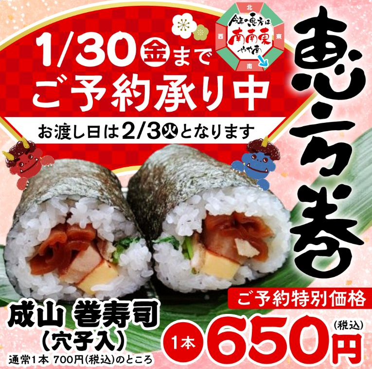 恵方巻 ご予約承り中! 【成山さんの恵方巻き】 ご予約が始まりました!   今年の恵方は「南南東」   ... 続きを見る >